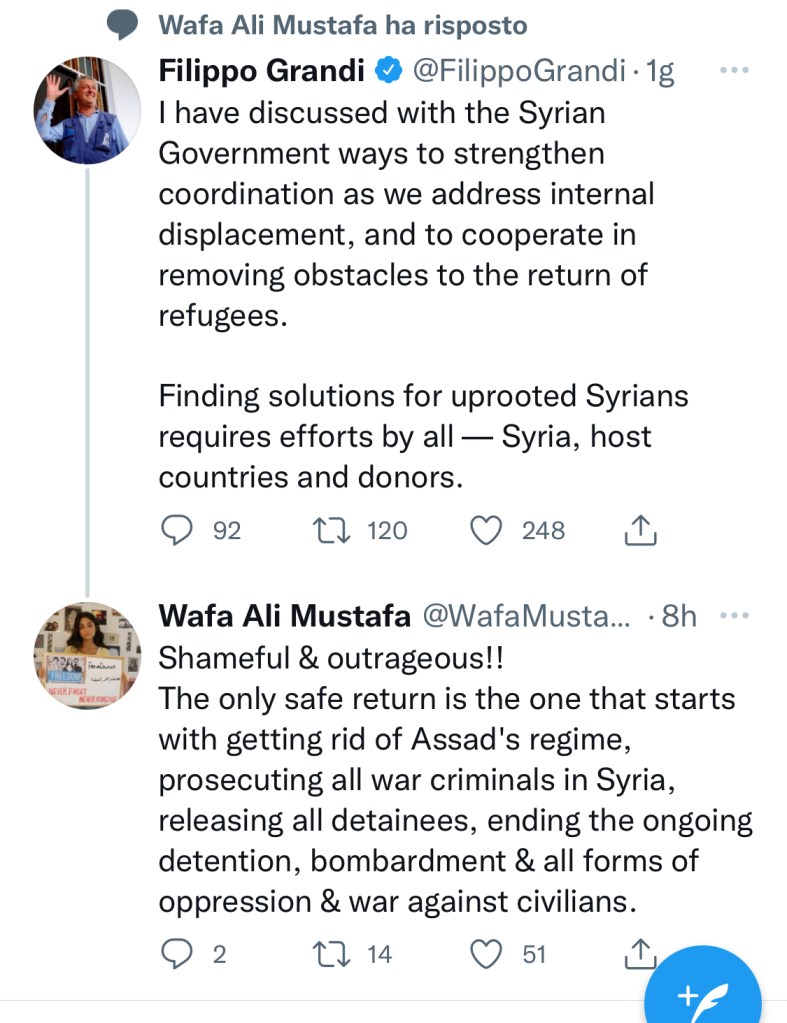 Si legge nel comunicato di UNHCR: “Filippo Grandi ha incontrato il Ministro siriano per gli affari esteri, Faisal Mekdad, e il Ministro per l’amministrazione locale e l’ambiente, Hussein Makhlouf, con cui ha discusso le questioni legate al ritorno delle persone costrette a fuggire, comprese le modalità di risposta alle esigenze dei rifugiati. «Queste persone sono cittadini siriani ed è responsabilità del governo garantirne la sicurezza». E ancora: “Siamo impegnati a mettere in rilievo col governo le preoccupazioni espresse dai rifugiati, quali quelle relative a sicurezza, diritti di proprietà e opportunità di sostentamento. È poi necessario che anche la comunità internazionale dia il proprio aiuto per assicurare le risorse necessarie affinché le persone, inoltre, possano riparare le case danneggiate, disporre di acqua corrente, assistenza sanitaria e mandare i figli a scuola. Affinché il ritorno delle persone sia sostenibile è necessaria la collaborazione di tutte le parti coinvolte. Infine, dobbiamo garantire sostegno continuo ai rifugiati e ai Paesi che li accolgono”. Le persone prima di tutto, e i loro benessere, i loro diritti. Ma è tutto bello e buono. E qualcosa apre un buco nello stomaco: è il clima da “come nulla fosse successo”. Sono accordi con un regime genocida che, più che vinto una guerra civile, ha schiacciato gli oppositori e massacrato la popolazione civile con l’aiuto di altre tre potenze e un gruppo terroristico dal paese limitrofo non disdegnando attacchi chimici, arresti di massa e torture e pulizia etnica spacciandoli per “mali minori”, giustificati con l’immagine del “noi i soli paladini della lotta al Daesh”. La popolazione, fuori e dentro il paese, è allo stremo e a Idlib non si è mai smesso di bombardare i civili. I paese non esiste più, tranne le aree lealiste nelle principali città, certi quartieri di lusso in costruzione sulle macerie delle case degli sfollati e mercati storici e moschee restaurati per farci fare le foto agli amici filo regime e al ministero del Turismo. Fondi e aiuti li fagociterà in discrete percentuali il regime per alimentare i propri interessi e quelli degli alleati (ed è già avvenuto, tramite le carity della signora Assad). Dati e constatazioni che mi mettono a disagio, come vedere le foto di Grandi sui social, le cui caratteristiche rientrano perfettamente negli standard della migliore propaganda assadista: scatto con rifugiati felici e sorridenti e gitarella alla Grande Moschea. Sotto i suoi tweet, tra critiche e anche qualche insulto, c’è il messaggio di Wafa Ali Mustafa, attivista che sui social tiene il conto dei giorni dalla scomparsa del padre nelle carceri del regime. Cara Wafa, è difficile contestarti.